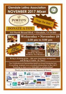Join us at our Glendale Latino Association Mixer! “Cops for Kids” Toy Drive Come join the fun! You'll have a chance to network while enjoying delicious food, surprising prizes and much, much more! Please remember to bring unwrapped gift(s) to our November Mixer. Gift cards make great gifts for teenagers. Invite your friends & coworkers to meet you at Porto’s Bakery & Café!