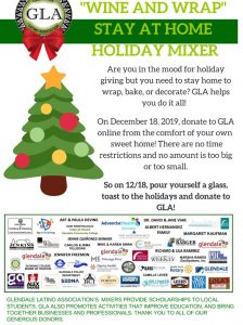 Glendale Latino Association requests the pleasure of your participation for our Wine & Wrap Stay At Home Holiday Mixer! Join in the Holiday Giving Spirit! To donate you may do so online or mail to Glendale Latino Association, P.O. Box 806, Verdugo City, CA 91046. WHEN: Anytime on Wednesday, December 18, 2019 or throughout the month of December! WHERE: Any place you feel most comfortable at home; by the fireplace, at the kitchen or dining room table, or anywhere you…