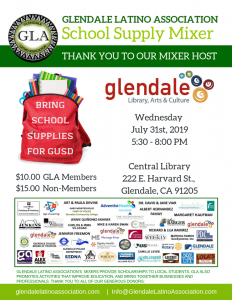 Join us for our Back to School Supply Drive Mixer at the beautiful at Downtown Central Library in Glendale, CA. Donate school supplies so we can in turn donate for the youth attending Glendale Unified schools. Appetizers, drinks and opportunity drawings will be available. See you there! Thank you to our mixer host Glendale Library Arts & Culture Join us on Wednesday, July 31st, 2019 at 5:30 pm Admission: $10.00 GLA Members $15.00 Non-Members Come network…