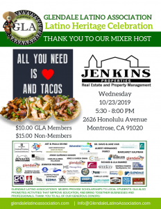 Join us for our GLA Latino Heritage Celebration It's going to be a FIESTA! Thank you to our mixer host Jenkins Properties Management. Come and enjoy delicious tacos, dance to great music, a chance to win awesome prizes, and other surprises! Invite your friends and tell them to meet you at the GLA mixer and support our Scholarship Fund. Join us on Wednesday, October 23rd, 2019 at 5:30 pm Admission: $10.00 GLA Members $15.00 Non-Members Come network with your fellow…