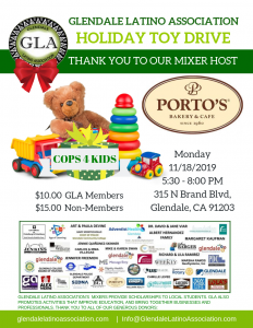 Join us for our GLA "Cops of Kids" Holiday Toy Drive Bring a toy or a gift card and get in the Holiday Spirit! Come on over for delicious food, friends and network in support of our Scholarship Fund. Thank you to our mixer host Porto's Bakery & Cafe Join us on Monday, November 18th, 2019 at 5:30 pm Admission: $10.00 GLA Members $15.00 Non-Members Come network with your fellow GLA friends and family. Friends please consider bringing a raffle…